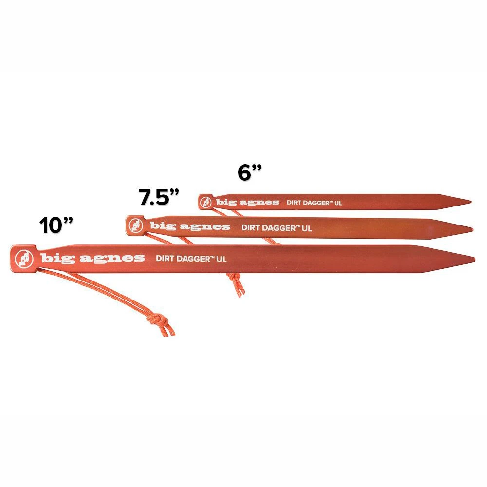 Dirt Dagger™ UL Tent Stakes are not your average stake. Designed with patent pending I-Beam aluminum construction for a stronger stake-out to keep your tent or shelter in place and to keep you safely protected from the elements. Our lightest and strongest stakes ever, you’ll notice the difference with a 25% increase in strength to weight ratio when you’re staking out or tugging the cord loop pull to pack up. Available in select tent models and sold separately in three sizes, 6” for crazy and ultralight tents, 7.5” for superlight setups, and 10” for car camping and shelters. Grab an extra set for your gear cache or gift one to your favorite camper, the Dirt Dagger™ UL Tent Stakes will make all the difference at camp.
