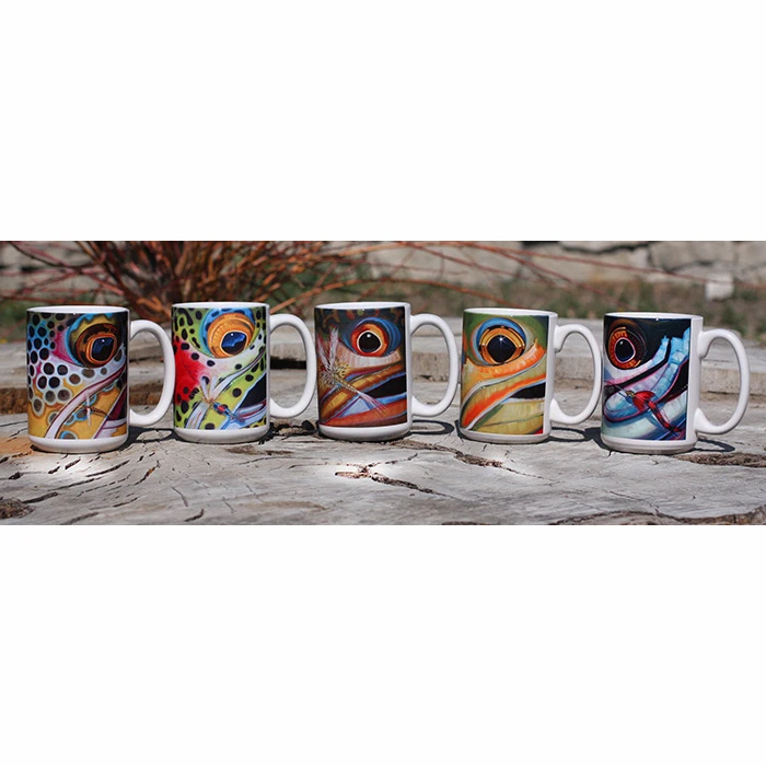 These hefty, 15 oz. fully printed mugs showcase the best of DeYoung’s Abstract Fish Face Series in bright, vivid detail. Available in Brown, Rainbow, Brookie, Cutthroat or Tarpon. Buy as singles or as sets. Microwave safe, but not dishwasher recommended. Made in the USA.
