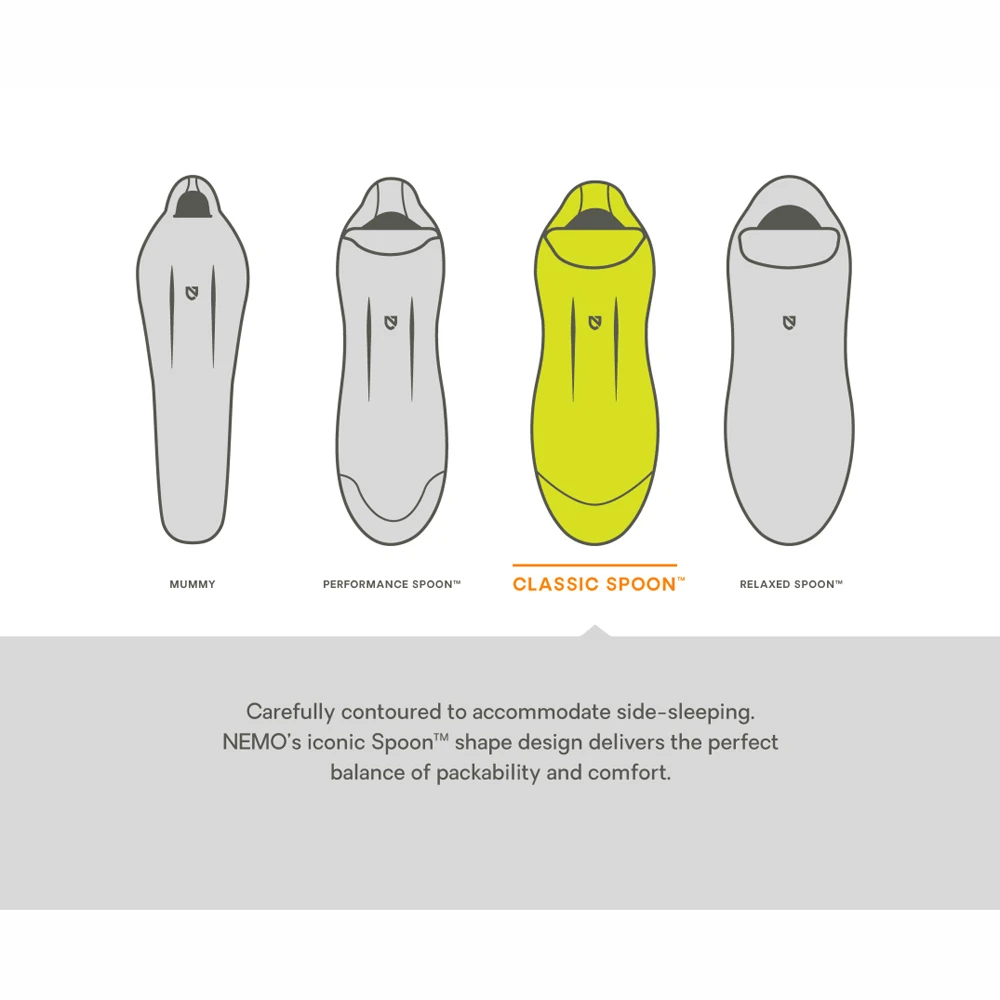 Updated with new contours, Disco continues to reign as the ideal down backpacking bag for side sleepers, offering the plushest comfort possible on the trail. Seventy percent of all people sleep on their side, which is why NEMO designed the iconic Spoon™ Shape bag to fine-tune the balance between comfort and packability.